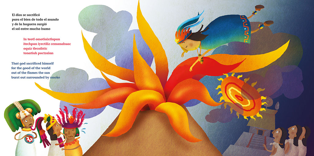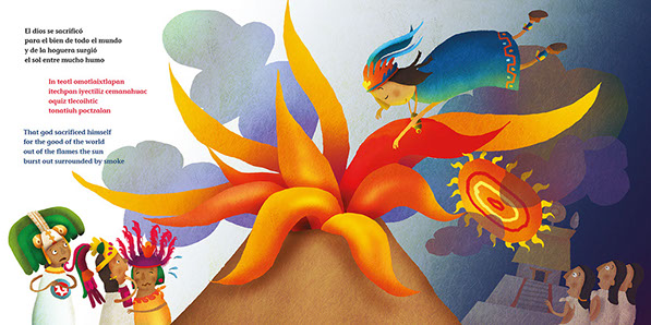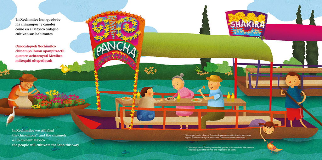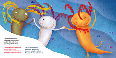 Textos escritos de manera rítmica con imágenes que describen el origen mítico de los ajolotes, sus extrordinarias características físicas, así como los riesgos que enfrentan para sobrevivir entre chinampas y flores como especie endémica.